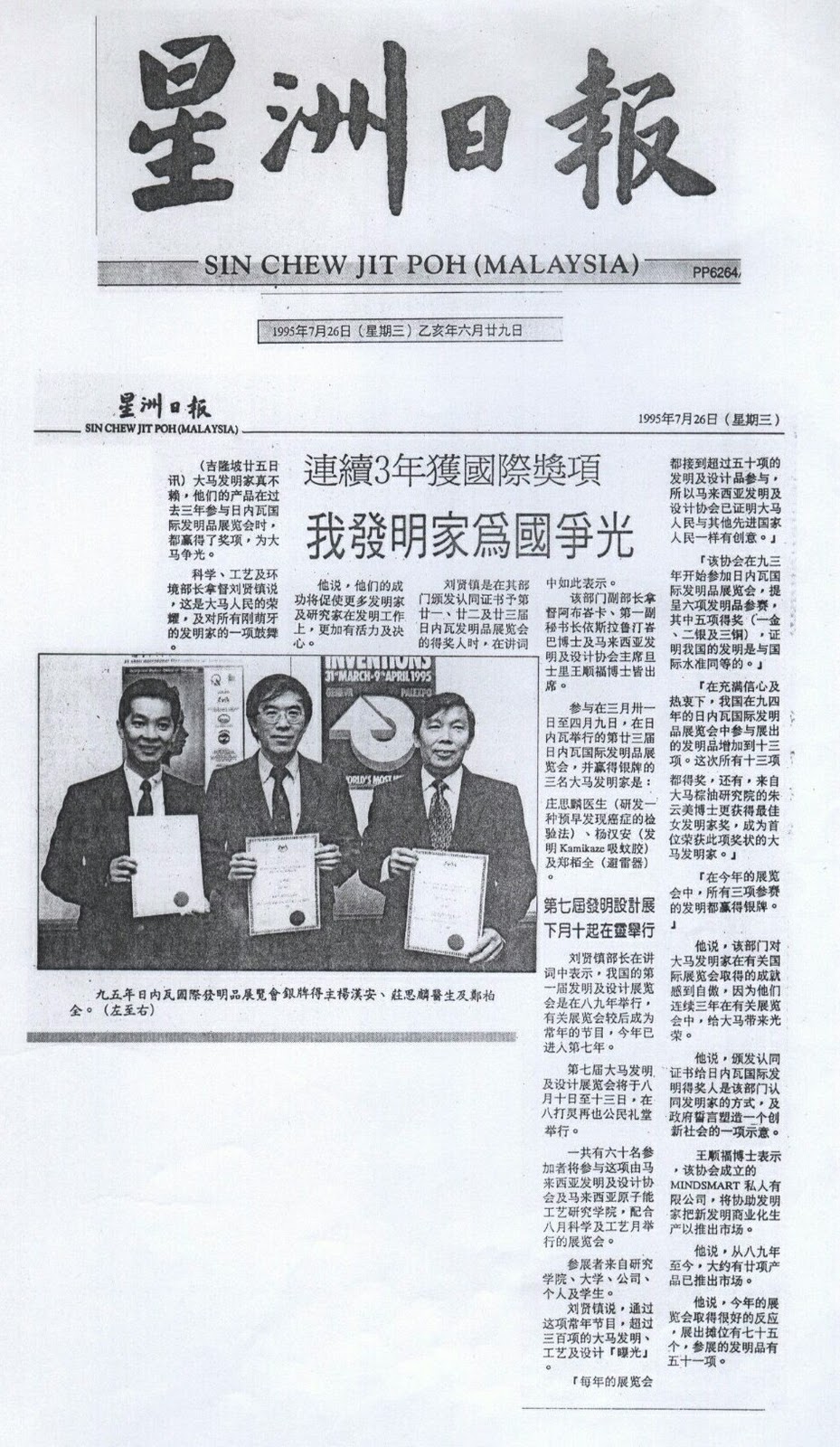 Silver Medal winner at the 1995 International Invention Fair in Geneva, Switzerland